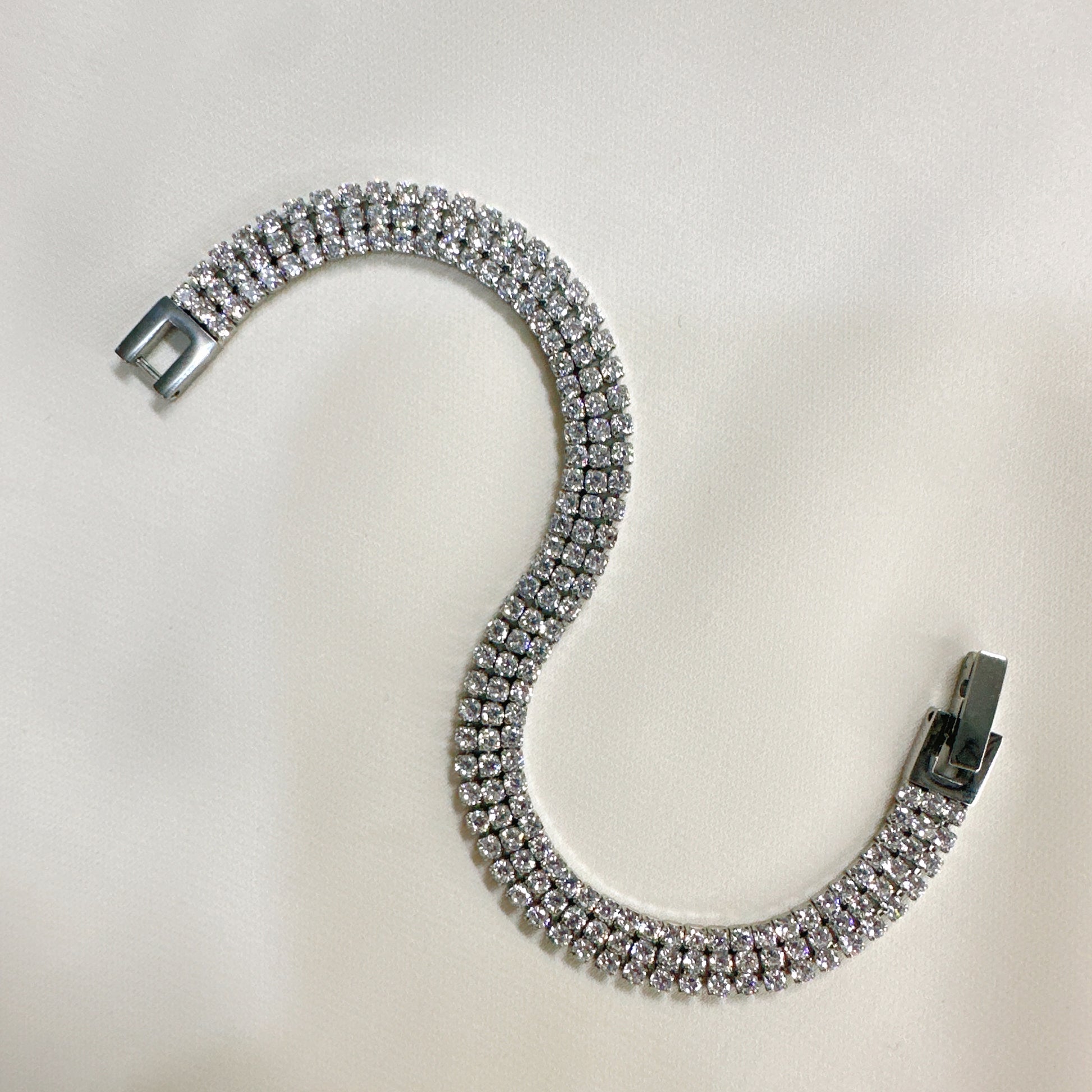 Dazzling and divine. The 3 row May Zirconia bracelet is a modern classic. Crafted from three rows of sparkling white zircons, this silver tone piece rests gracefully around the wrists. This versatile bracelet is perfect for both formal occasions and everyday wear, sure to sparkle wherever you go.